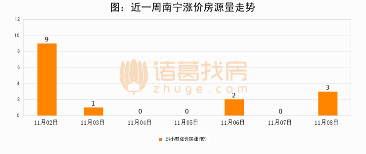 根据诸葛找房数据显示,南宁24小时涨价房源量为3套,较11月07日增加3套,环比上涨0%。与此同时,涨价房源占比小幅扩大,业主信心有所提升。