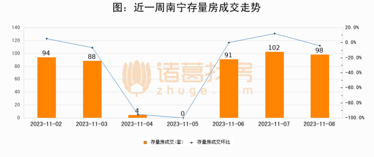 从存量房来看,2023年11月08日南宁存量房单日成交98套,比昨日减少4套,环比下降3.9%。从近一周存量房成交来看,南宁存量房日均成交套数为68套,11月08日单日成交98套,高于近一周平均水平44.1%。
