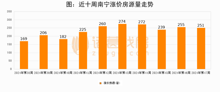 从调价房源来看,第47周南宁涨价房源251套,较上周下降1.6%。与此同时,47周涨价房源占比提升0.18个百分点,业主信心持续恢复。