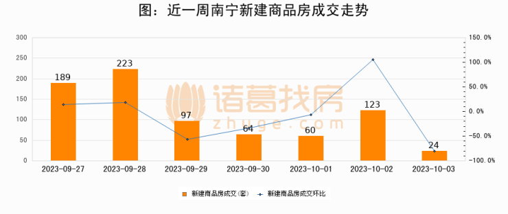 根据南宁市住房和城乡建设局数据显示,2023年10月03日南宁新建商品房成交24套,较昨日减少99套,环比下降80.5%。近一周南宁新建商品房日均成交112套。10月03日单日成交24套,低于近一周平均水平78.6%。