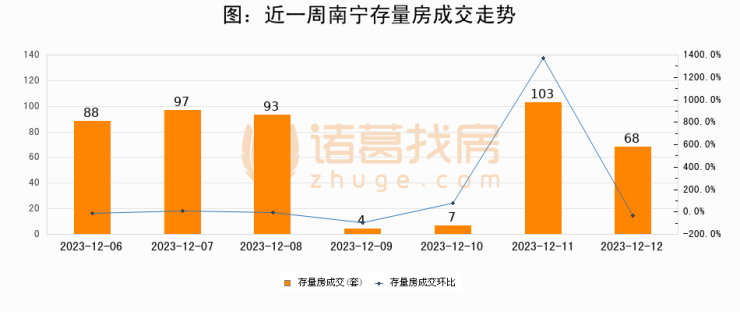 从存量房来看,2023年12月12日南宁存量房单日成交68套,比昨日减少35套,环比下降34%。从近一周存量房成交来看,南宁存量房日均成交套数为65套,12月12日单日成交68套,高于近一周平均水平4.6%。