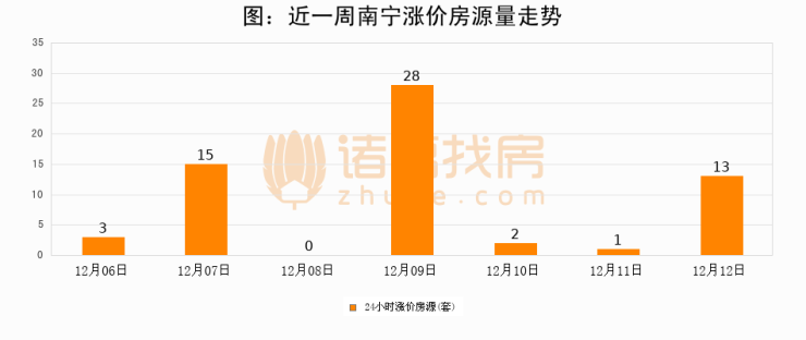 根据诸葛找房数据显示,南宁24小时涨价房源量为13套,较12月11日增加12套,环比上涨1200%。与此同时,涨价房源占比小幅扩大,业主信心有所提升。