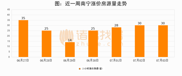 根据诸葛找房数据显示,南宁24小时涨价房源量为30套,较07月02日持平。