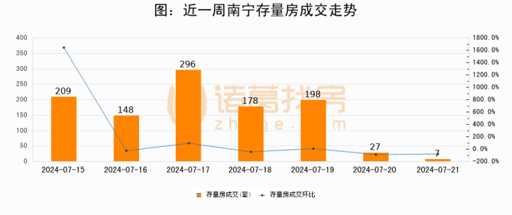 从存量房来看,2024年07月21日南宁存量房单日成交7套,比昨日减少20套,环比下降74.1%。从近一周存量房成交来看,南宁存量房日均成交套数为151套,07月21日单日成交7套,低于近一周平均水平95.4%。