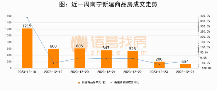根据南宁市住房和城乡建设局数据显示,2023年12月24日南宁新建商品房成交134套,较昨日减少66套,环比下降33%。近一周南宁新建商品房日均成交547套。12月24日单日成交134套,低于近一周平均水平75.5%。