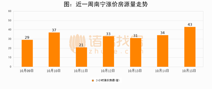 根据诸葛找房数据显示,南宁24小时涨价房源量为43套,较10月14日增加9套,环比上涨26.5%。与此同时,涨价房源占比小幅扩大,业主信心有所提升。