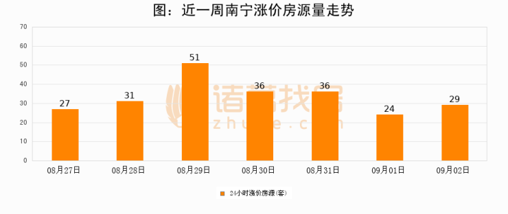根据诸葛找房数据显示,南宁24小时涨价房源量为29套,较09月01日增加5套,环比上涨20.8%。与此同时,涨价房源占比小幅扩大,业主信心有所提升。