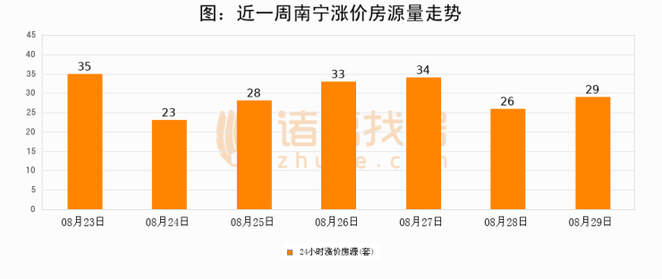 根据诸葛找房数据显示,南宁24小时涨价房源量为29套,较08月28日增加3套,环比上涨11.5%。与此同时,涨价房源占比小幅扩大,业主信心有所提升。