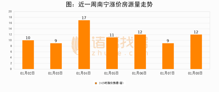 根据诸葛找房数据显示,南宁24小时涨价房源量为12套,较01月07日增加3套,环比上涨33.3%。与此同时,涨价房源占比小幅扩大,业主信心有所提升。
