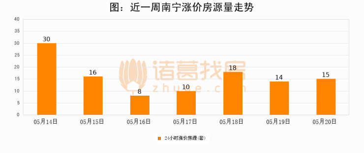 根据诸葛找房数据显示,南宁24小时涨价房源量为15套,较05月19日增加1套,环比上涨7.1%。与此同时,涨价房源占比小幅扩大,业主信心有所提升。
