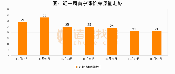 根据诸葛找房数据显示,南宁24小时涨价房源量为21套,较05月27日持平。