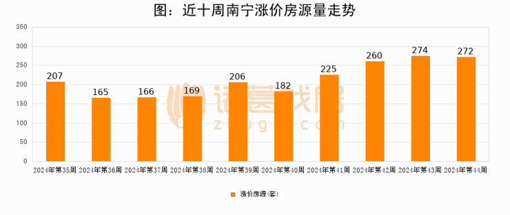 从调价房源来看,第44周南宁涨价房源272套,较上周下降0.7%。与此同时,44周涨价房源占比回落0.58个百分点,业主信心小幅波动,购房者可则需入市。