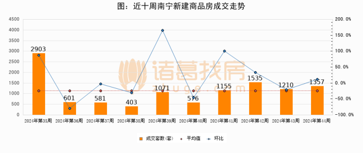 进入2024年第44周(10月28日-11月03日),南宁新建商品房成交1357套,较上周增加147套,环比上涨12.2%