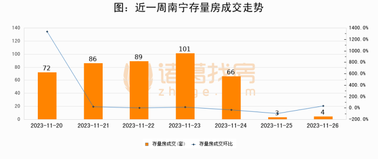 从存量房来看,2023年11月26日南宁存量房单日成交4套,比昨日增加1套,环比上涨33.3%。从近一周存量房成交来看,南宁存量房日均成交套数为60套,11月26日单日成交4套,低于近一周平均水平93.3%。