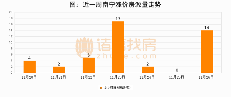根据诸葛找房数据显示,南宁24小时涨价房源量为14套,较11月25日增加14套,环比上涨0%。与此同时,涨价房源占比小幅扩大,业主信心有所提升。
