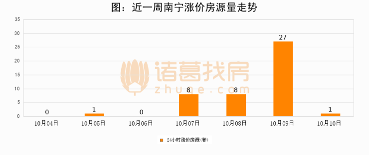 根据诸葛找房数据显示,南宁24小时涨价房源量为1套,较10月09日减少26套,环比下降96.3%。与此同时,涨价房源占比小幅回落,对于购房者来说是一个入市窗口期,购房者可抓住时机入市。