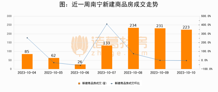根据南宁市住房和城乡建设局数据显示,2023年10月10日南宁新建商品房成交223套,较昨日减少8套,环比下降3.5%。近一周南宁新建商品房日均成交142套。10月10日单日成交223套,高于近一周平均水平57%。