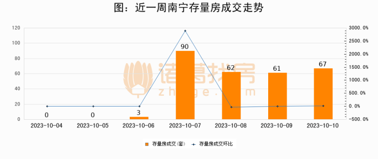 从存量房来看,2023年10月10日南宁存量房单日成交67套,比昨日增加6套,环比上涨9.8%。从近一周存量房成交来看,南宁存量房日均成交套数为40套,10月10日单日成交67套,高于近一周平均水平67.5%。