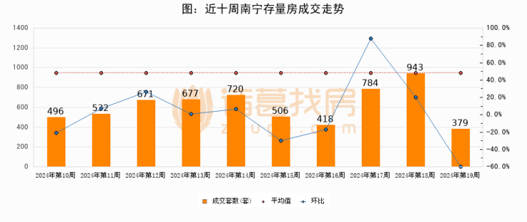 存量房方面,第18周南宁存量房成交379套,较上周减少564套,环比下降59.8%。从近十周成交走势来看,周均成交套数为612套,本周低于平均水平38.1%。