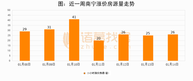 根据诸葛找房数据显示,南宁24小时涨价房源量为26套,较01月13日增加1套,环比上涨4%。与此同时,涨价房源占比小幅扩大,业主信心有所提升。