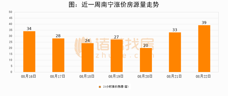 根据诸葛找房数据显示,南宁24小时涨价房源量为39套,较08月21日增加6套,环比上涨18.2%。与此同时,涨价房源占比小幅扩大,业主信心有所提升。