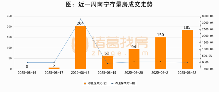 从存量房来看,2025年08月22日南宁存量房单日成交185套,比昨日增加35套,环比上涨23.3%。从近一周存量房成交来看,南宁存量房日均成交套数为100套,08月22日单日成交185套,高于近一周平均水平85%。