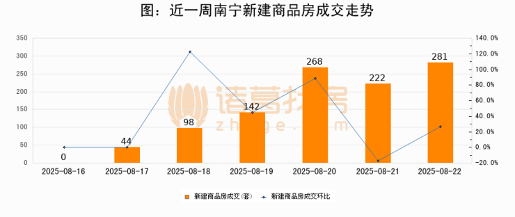 根据南宁市住房和城乡建设局数据显示,2025年08月22日南宁新建商品房成交281套,较昨日增加59套,环比上涨26.6%