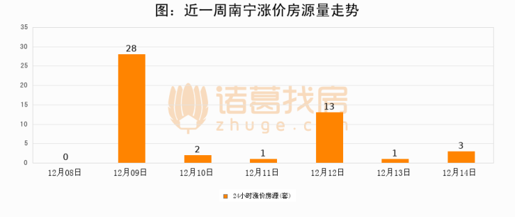 根据诸葛找房数据显示,南宁24小时涨价房源量为3套,较12月13日增加2套,环比上涨200%。与此同时,涨价房源占比小幅扩大,业主信心有所提升。