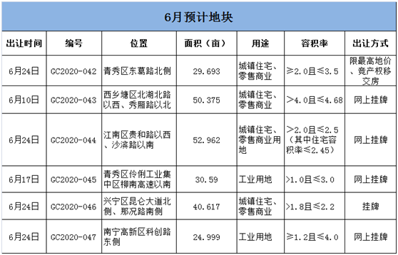 229亩地已上架东葛路30亩限价地6月底出让5月商住地基本完成出让,6月新一轮土地供应已在路上。大v君不完全统计,截止5月26日,6月将有229亩土地出让,主要分布在青秀、西乡塘、江南、兴宁等区域,有两幅工业用地,其余均为城镇住宅用地,出让方式为挂牌或网上挂牌。