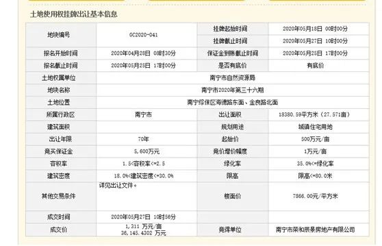 13家房企围猎荣和3.6亿斩获五象南28亩地争夺最激烈的,是五象南的GC2020-041地块。该地块位于海德路东面、金良路北面,占地27.571亩商住地,以网上挂牌的方式出让。据了解,地块吸引龙光、大唐、荣和等13家房企“围猎”。从上午9时55分开始,报价逐轮上升,几乎是每隔一分钟的时间就有一家房企加价。直到上午10时52分,报价才结束,竞拍时长近1个小时。