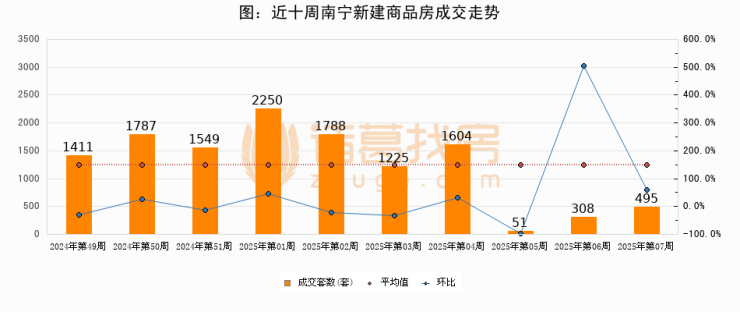 进入2025年第07周(02月10日-02月16日),南宁新建商品房成交495套,较上周增加187套,环比上涨60.7%