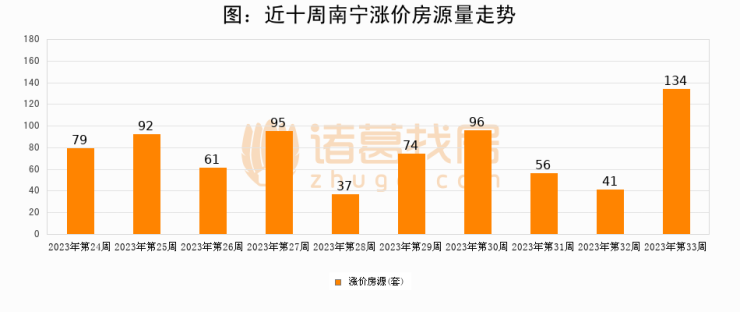从调价房源来看,第33周南宁涨价房源134套,较上周上涨226.8%。与此同时,33周涨价房源占比回落0.64个百分点,业主信心小幅波动,购房者可则需入市。