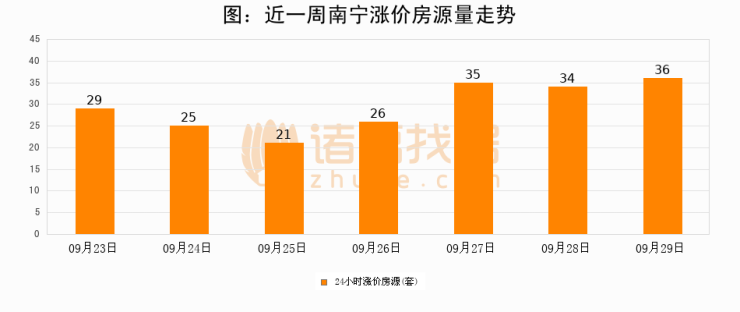 根据诸葛找房数据显示,南宁24小时涨价房源量为36套,较09月28日增加2套,环比上涨5.9%。与此同时,涨价房源占比小幅扩大,业主信心有所提升。