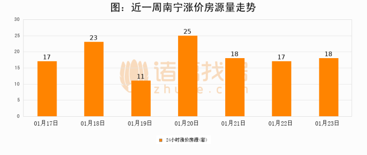 根据诸葛找房数据显示,南宁24小时涨价房源量为18套,较01月22日增加1套,环比上涨5.9%。与此同时,涨价房源占比小幅扩大,业主信心有所提升。