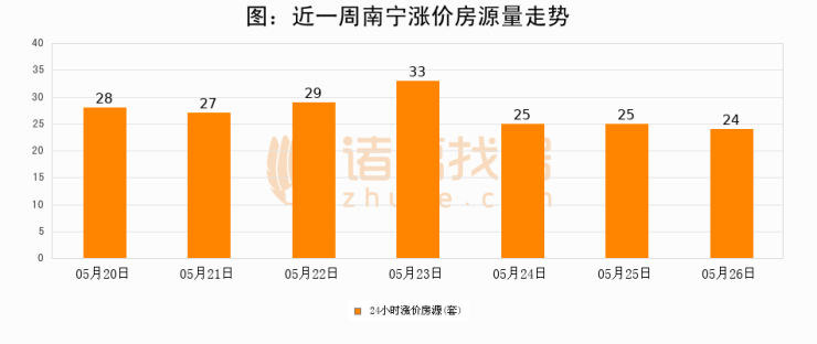 根据诸葛找房数据显示,南宁24小时涨价房源量为24套,较05月25日减少1套,环比下降4%。与此同时,涨价房源占比小幅回落,对于购房者来说是一个入市窗口期,购房者可抓住时机入市。