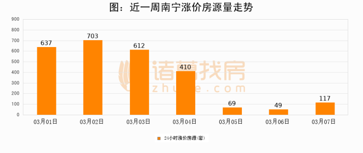 根据诸葛找房数据显示,南宁24小时涨价房源量为117套,较03月06日增加68套,环比上涨138.8%。与此同时,涨价房源占比小幅扩大,业主信心有所提升。