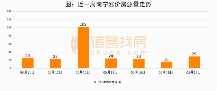根据诸葛找房数据显示,南宁24小时涨价房源量为29套,较05月16日增加13套,环比上涨81.2%。与此同时,涨价房源占比小幅扩大,业主信心有所提升。