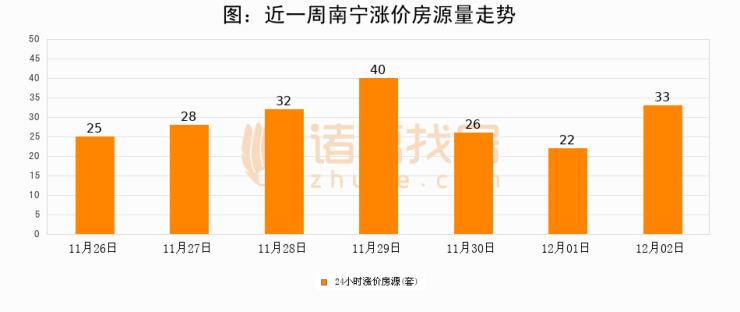 根据诸葛找房数据显示,南宁24小时涨价房源量为33套,较12月01日增加11套,环比上涨50%。与此同时,涨价房源占比小幅扩大,业主信心有所提升。