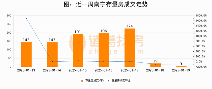 从存量房来看,2025年01月19日南宁存量房单日成交3套,比昨日减少16套,环比下降84.2%。从近一周存量房成交来看,南宁存量房日均成交套数为131套,01月19日单日成交3套,低于近一周平均水平97.7%。
