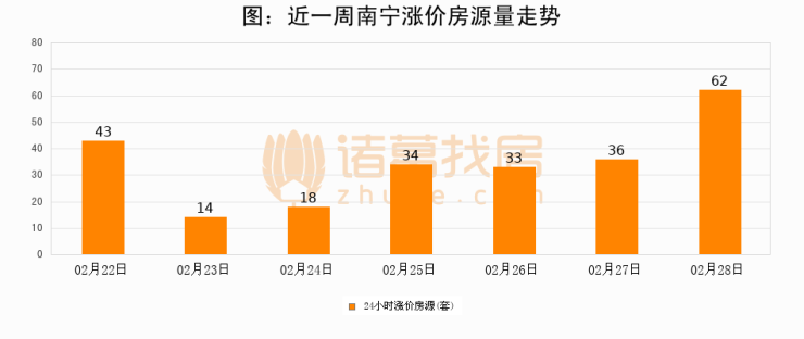 根据诸葛找房数据显示,南宁24小时涨价房源量为62套,较02月27日增加26套,环比上涨72.2%。与此同时,涨价房源占比小幅扩大,业主信心有所提升。