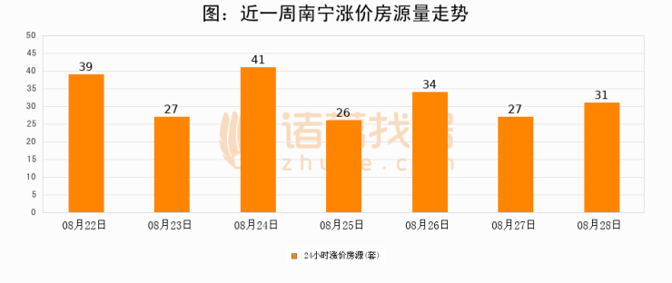 根据诸葛找房数据显示,南宁24小时涨价房源量为31套,较08月27日增加4套,环比上涨14.8%。与此同时,涨价房源占比小幅扩大,业主信心有所提升。