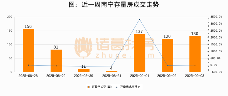 从存量房来看,2025年09月03日南宁存量房单日成交130套,比昨日增加10套,环比上涨8.3%。从近一周存量房成交来看,南宁存量房日均成交套数为91套,09月03日单日成交130套,高于近一周平均水平42.9%。