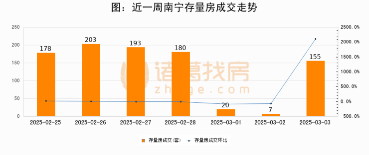 从存量房来看,2025年03月03日南宁存量房单日成交155套,比昨日增加148套,环比上涨2114.3%。从近一周存量房成交来看,南宁存量房日均成交套数为133套,03月03日单日成交155套,高于近一周平均水平16.5%。