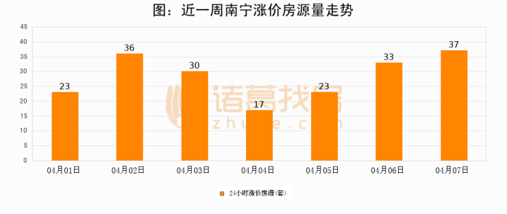 根据诸葛找房数据显示,南宁24小时涨价房源量为37套,较04月06日增加4套,环比上涨12.1%。与此同时,涨价房源占比小幅扩大,业主信心有所提升。