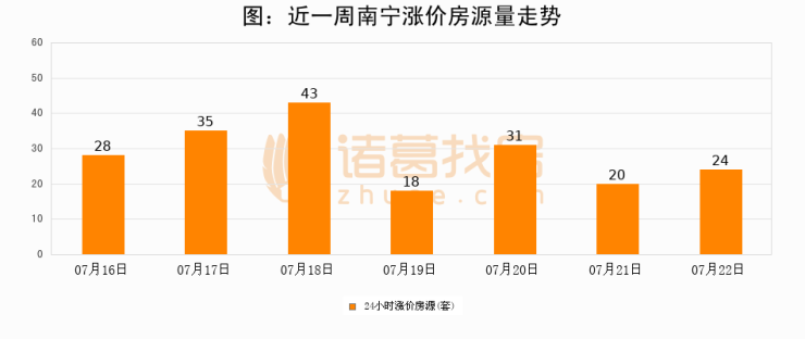 根据诸葛找房数据显示,南宁24小时涨价房源量为24套,较07月21日增加4套,环比上涨20%。与此同时,涨价房源占比小幅扩大,业主信心有所提升。