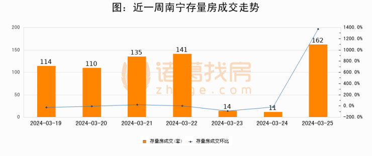 从存量房来看,2024年03月25日南宁存量房单日成交162套,比昨日增加151套,环比上涨1372.7%。从近一周存量房成交来看,南宁存量房日均成交套数为98套,03月25日单日成交162套,高于近一周平均水平65.3%。