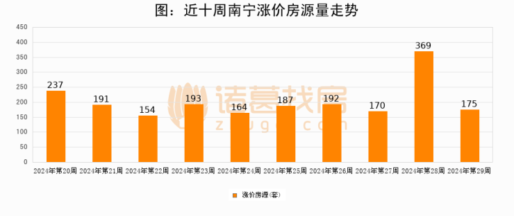 从调价房源来看,第29周南宁涨价房源175套,较上周下降52.6%。与此同时,29周涨价房源占比提升3.06个百分点,业主信心持续恢复。