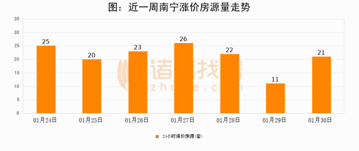 根据诸葛找房数据显示,南宁24小时涨价房源量为21套,较01月29日增加10套,环比上涨90.9%。与此同时,涨价房源占比小幅扩大,业主信心有所提升。