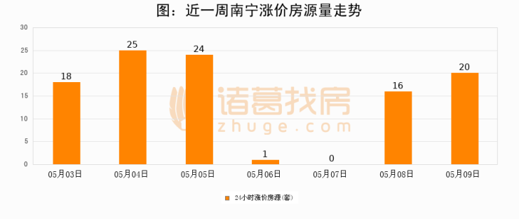 根据诸葛找房数据显示,南宁24小时涨价房源量为20套,较05月08日增加4套,环比上涨25%。与此同时,涨价房源占比小幅扩大,业主信心有所提升。