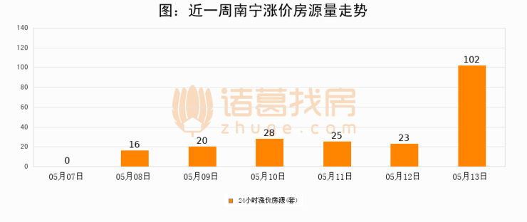 根据诸葛找房数据显示,南宁24小时涨价房源量为102套,较05月12日增加79套,环比上涨343.5%。与此同时,涨价房源占比小幅扩大,业主信心有所提升。
